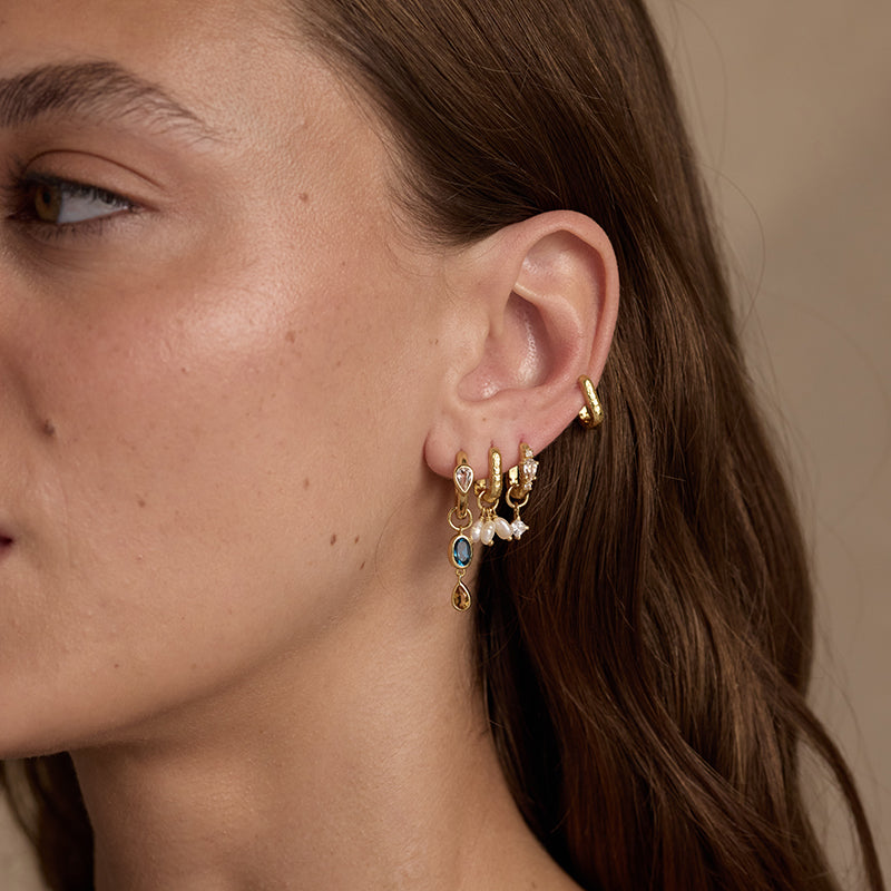 An intentional departure from the fine, minimal jewellery aesthetic, the collection features a selection of gemstone huggies that can be worn interchangeably with all of TONIMAY's existing earring charms or styled on their own.