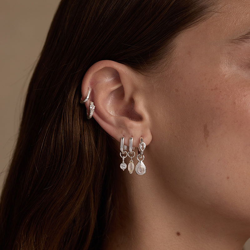 An intentional departure from the fine, minimal jewellery aesthetic, the collection features a selection of gemstone huggies that can be worn interchangeably with all of TONIMAY's existing earring charms or styled on their own.