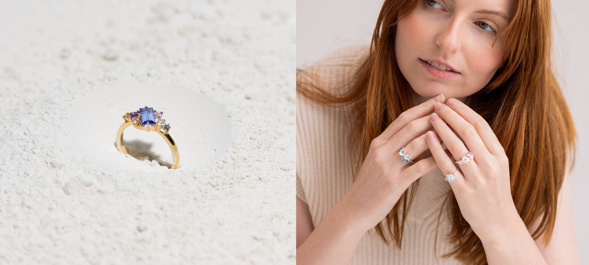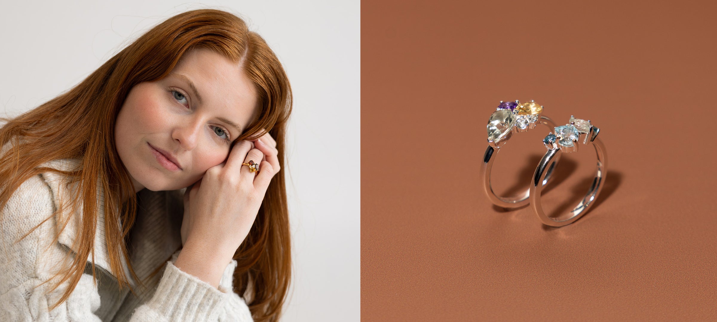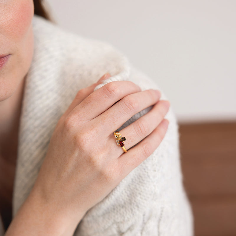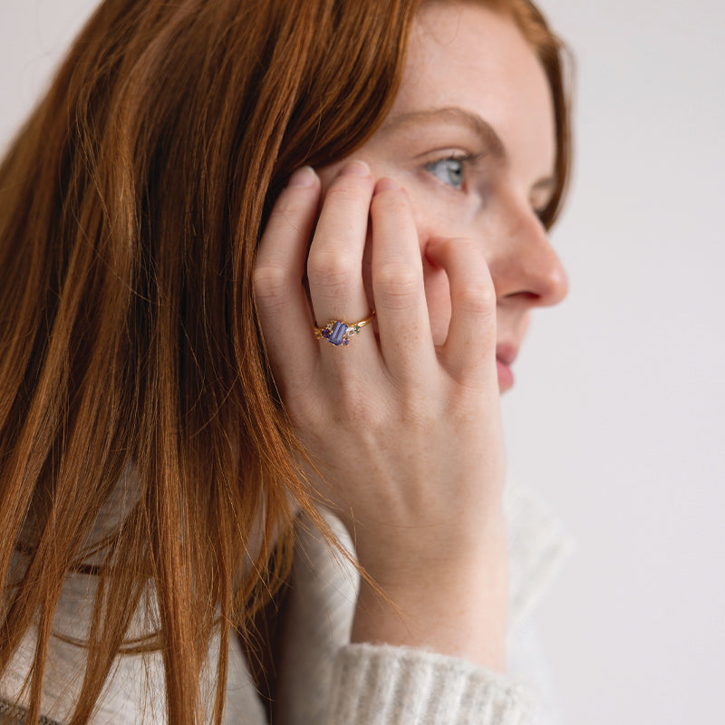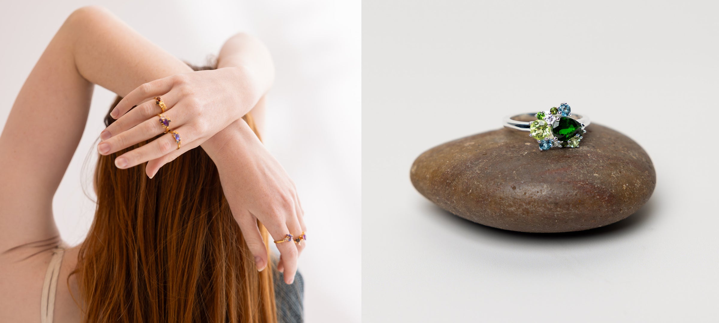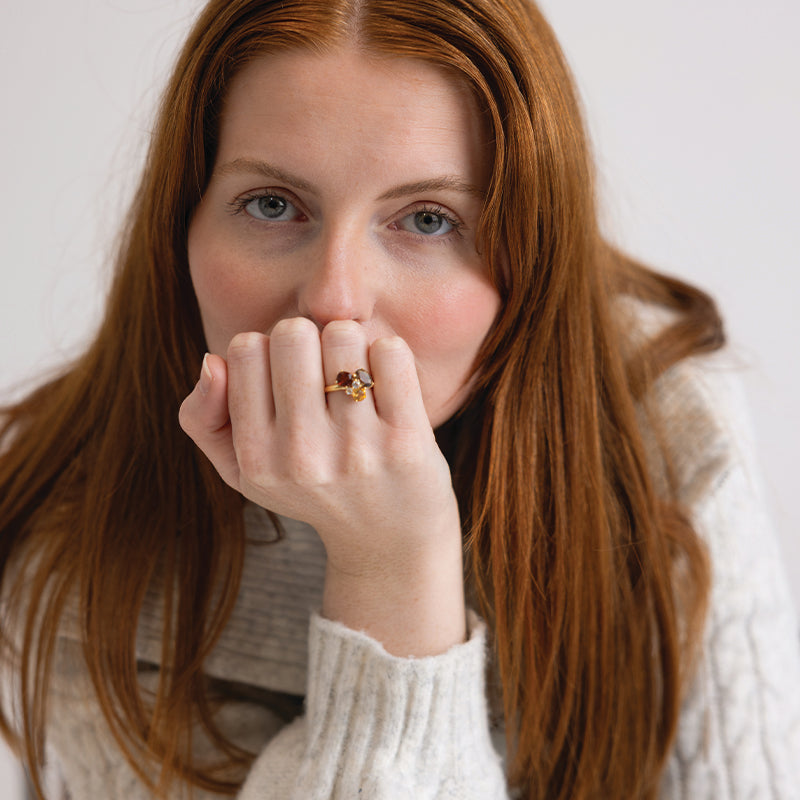 Delicate yet radiant, Bloom captures the feeling of becoming, like petals unfolding or light shifting through leaves. Inspired by nature’s quiet beauty, each ring brings together a mix of natural stones in unique cuts, colours and types.