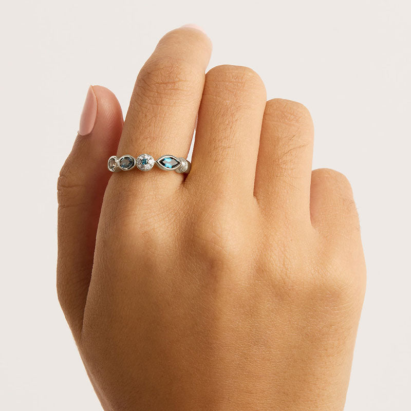 Embrace the power of positivity and protect yourself from negativity with the Protection of Eye Topaz Ring. Set with natural blue topaz and cubic zirconias in claw and bezel settings, this radiant stacking ring is a tribute to the watchful evil eye.