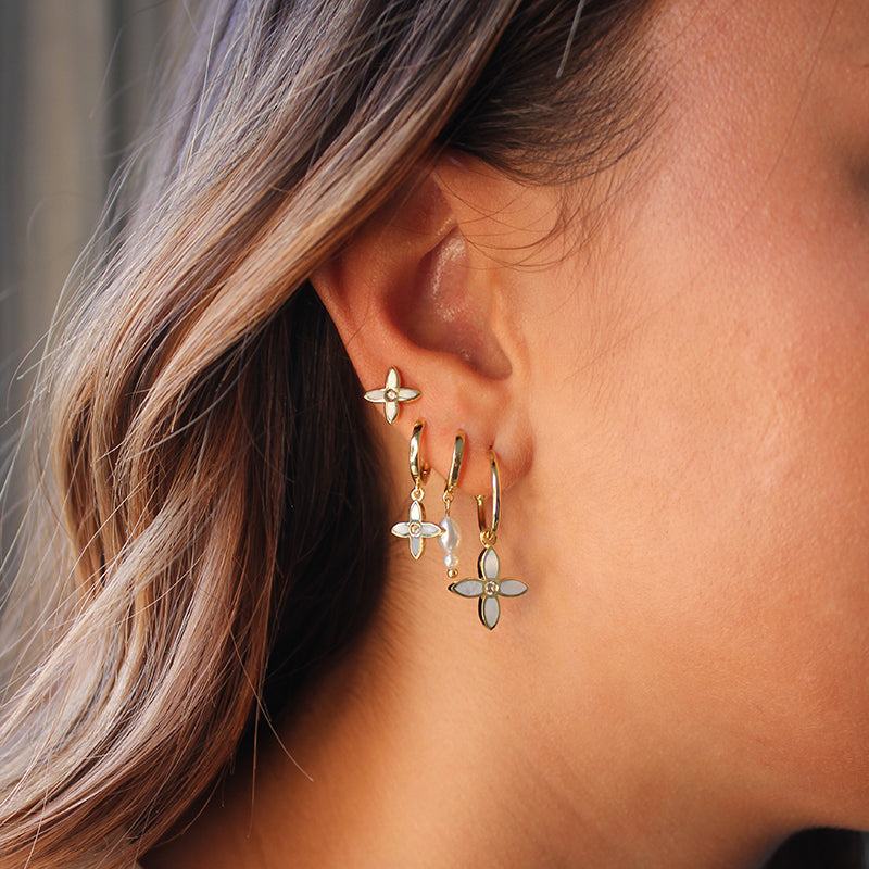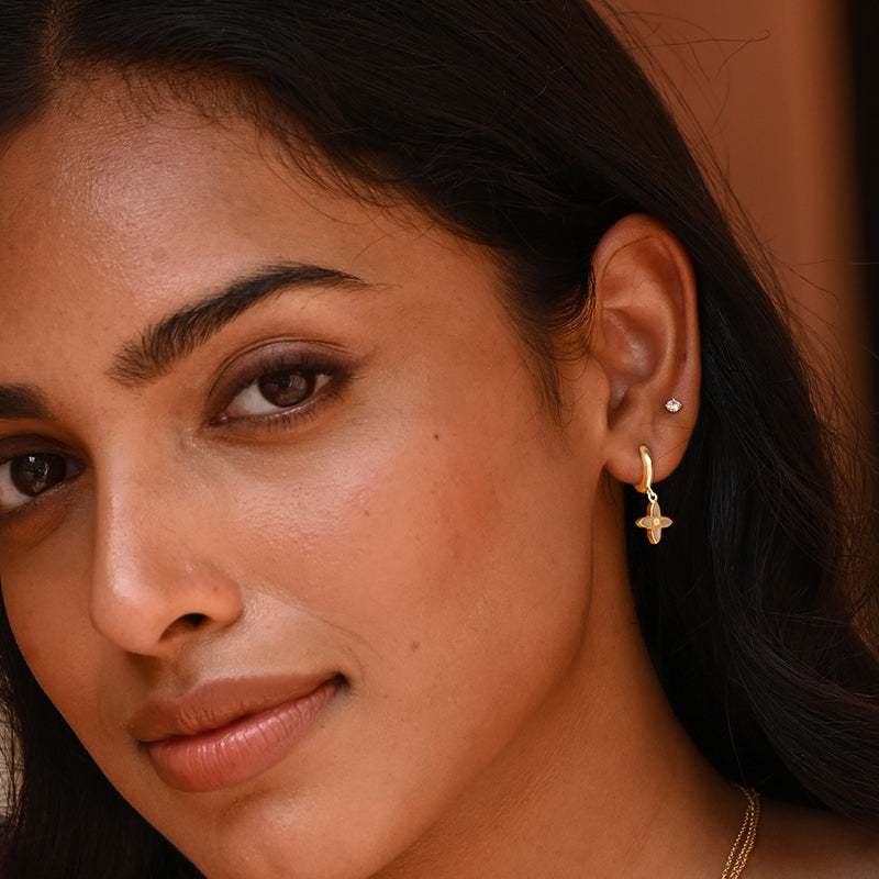 The Desert Flower Huggies feature a shimmering White Topaz and Mother of Pearl pendant suspended from a delicate huggie earring, designed to layer effortlessly and capture the magic of bohemian charm.