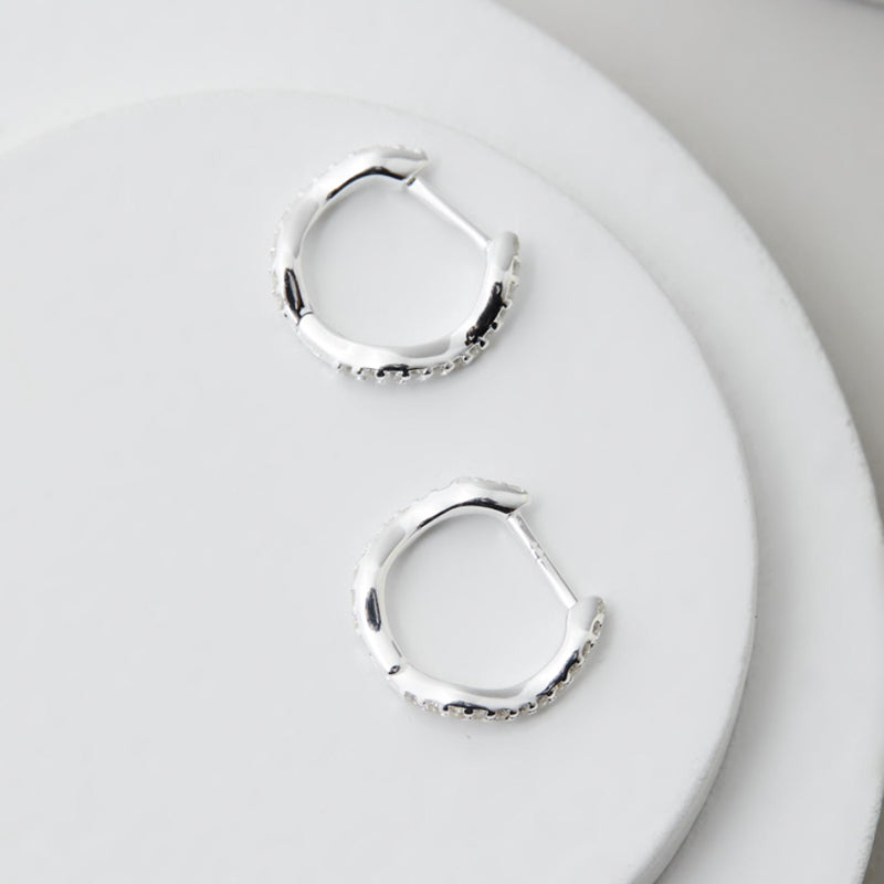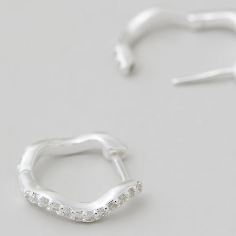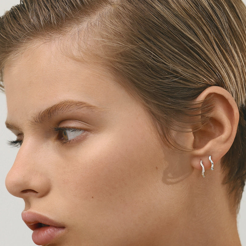 The Luna Wave Huggies are a perfect everyday addition with a unique curved shape, light catching Zirconia crystals and a lightweight design. Wear from day to night or pair with the Luna Wave Hoops for a modern ear stack.