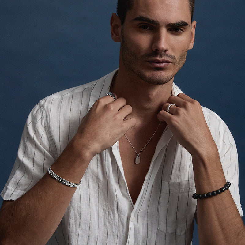 Shop the latest styles in men's jewellery, including rings, bracelets, necklaces, and watches. Available in silver, gold, stainless steel, and a variety of leather jewellery pieces.