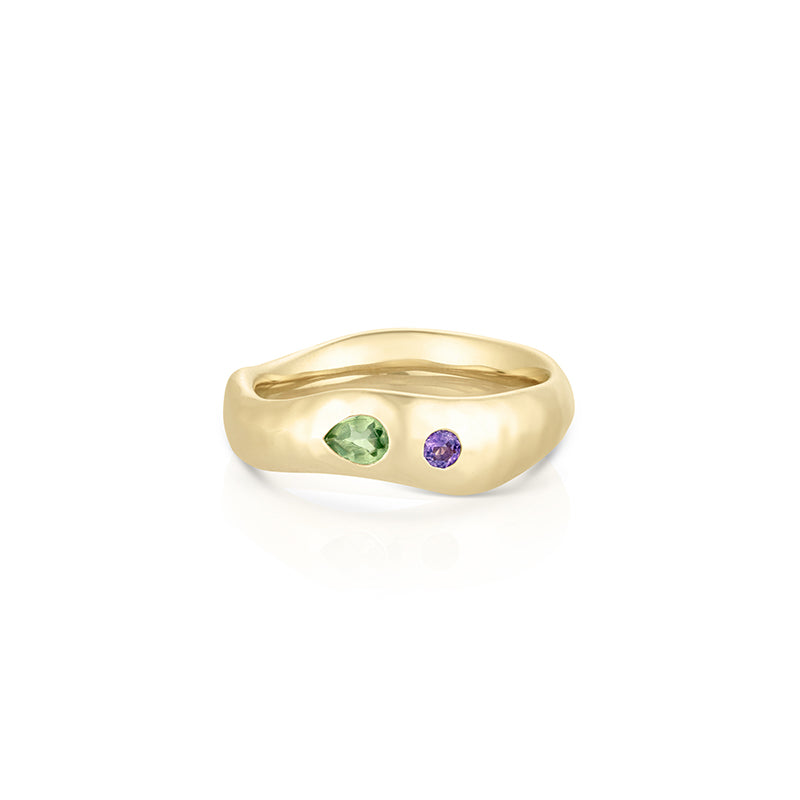 The Willa Ring was made to feel like it has always been yours. Its organically shaped, hammered band cradles a pear-shaped Apatite and round Amethyst - flush set into the surface like treasures tucked into stone.