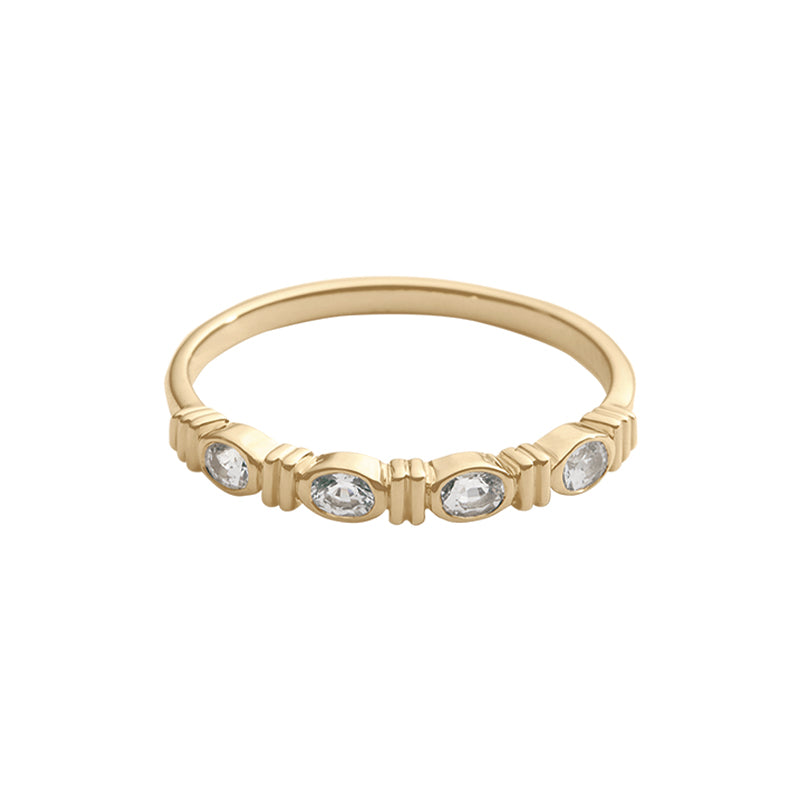 With its vintage-inspired design, the Elysium Oval Sapphire Ring features four oval-cut white sapphires set in 9k solid gold. A treasured keepsake, this piece is destined to become a beloved heirloom.