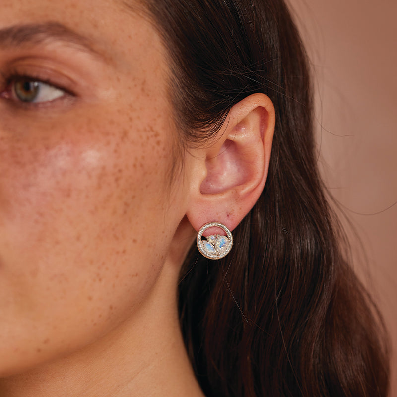 Featuring three Moonstones in a beautifully balanced design, the Pia Earrings offer a unique, organic feel. Nestled together in a lightly textured ring, these earrings bring beauty to your everyday.