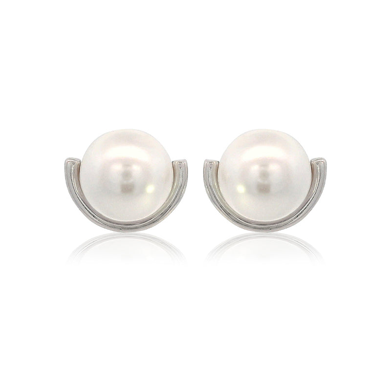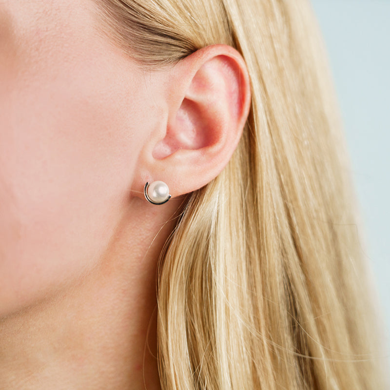 The Crescent Nine-2-Five Pearl Earrings features a luminous pearl cradled within a graceful crescent shape.