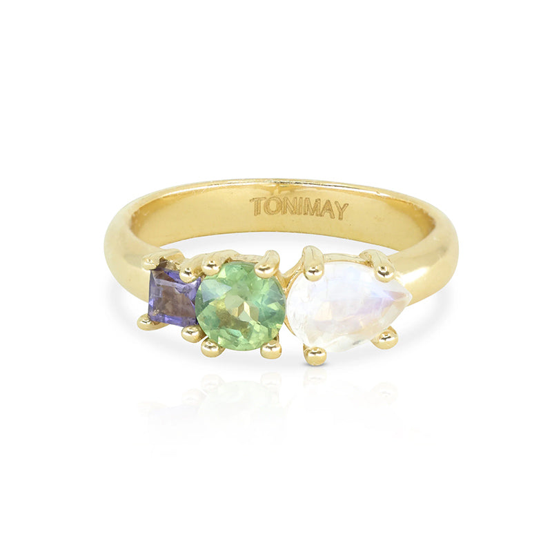 The Dixie Ring is a cluster set band featuring a graduating set of delicately claw set stones including a stunning rainbow Moonstone marquise, luminous round Apatite and bright Iolite baguette.