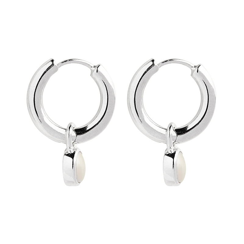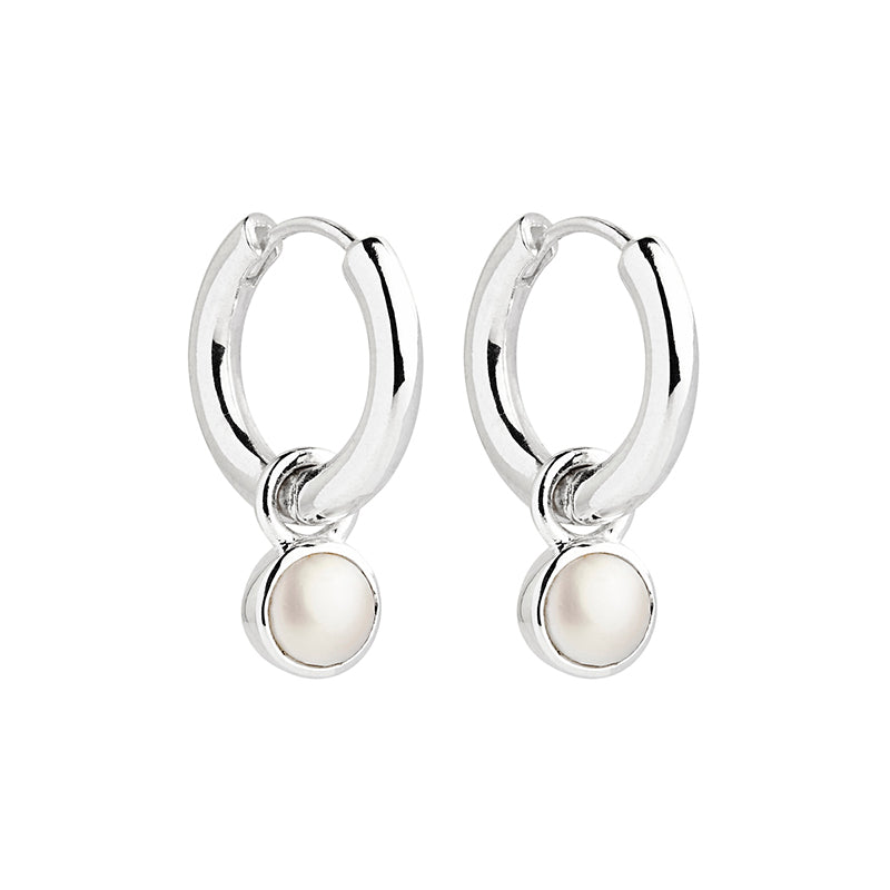 Sterling Silver huggie earring with freshwater button pearl drop.