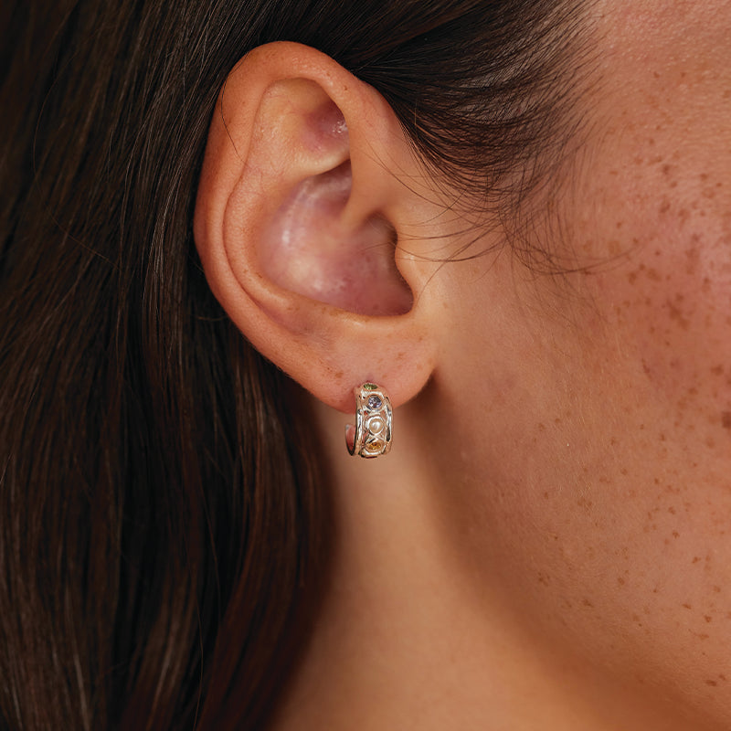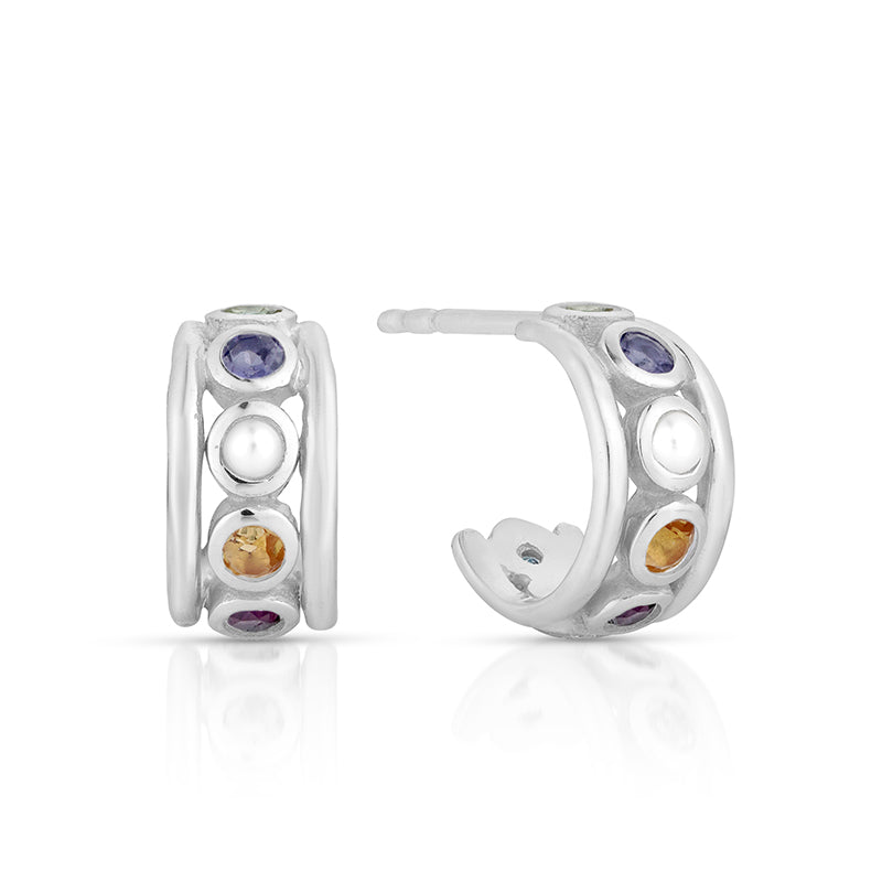 Set within the open centre, are 14 bezel-set gemstones—Apatite, Iolite, Pearl, Citrine, Rhodolite, Moonstone, and Blue Topaz—each adding its own unique character.