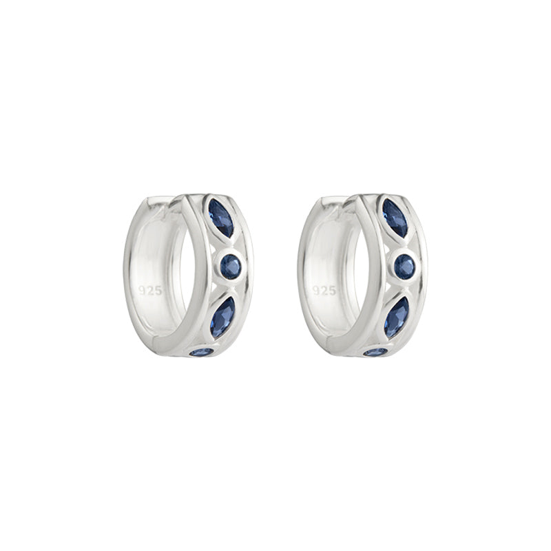 A harmonious blend of vintage inspiration and modern refinement, the Synergy Hoops feature a sequence of marquise and round-cut blue sapphire nano stones. Available in 18k gold plated or silver, this design embodies effortless wearability.